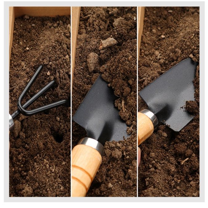 移植用の平型スコップ、土入れ用の尖型スコップ、土ほぐし用の熊手の三点が揃っており、鉢植えや多肉植物のお手入れに大変便利です。
