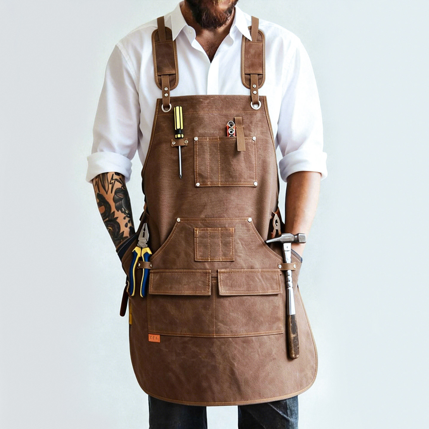 胸元や腰周りに複数のポケットを配置し、はさみやペン、小型工具などをすっきり収納できます。