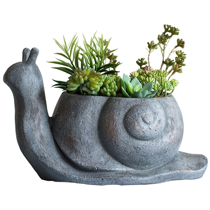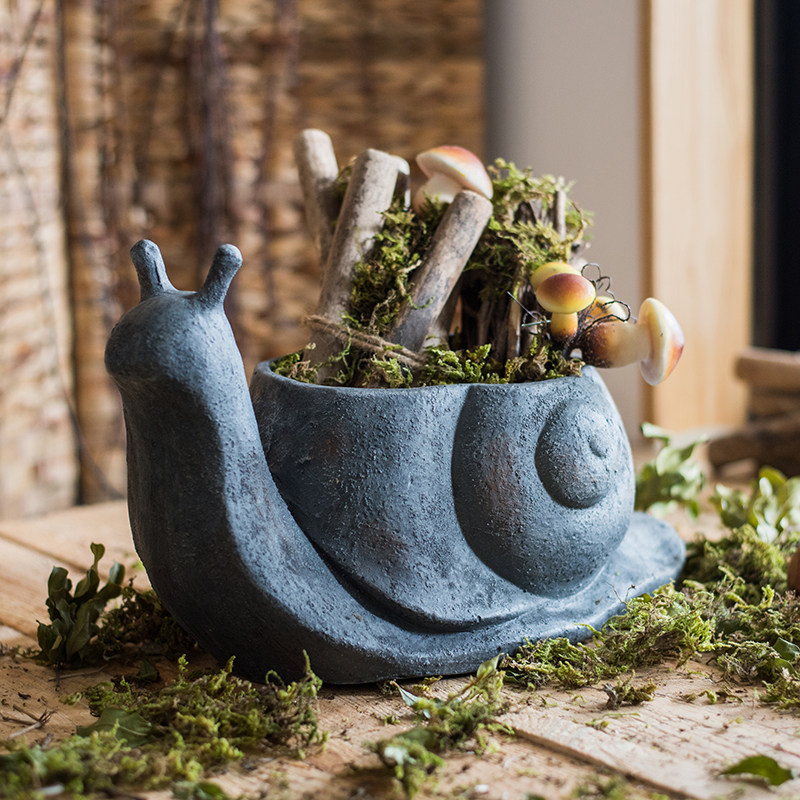 かたつむりとカエルのユーモラスな表情が空間を和ませ、多肉植物や小さな観葉植物の栽培に最適です。